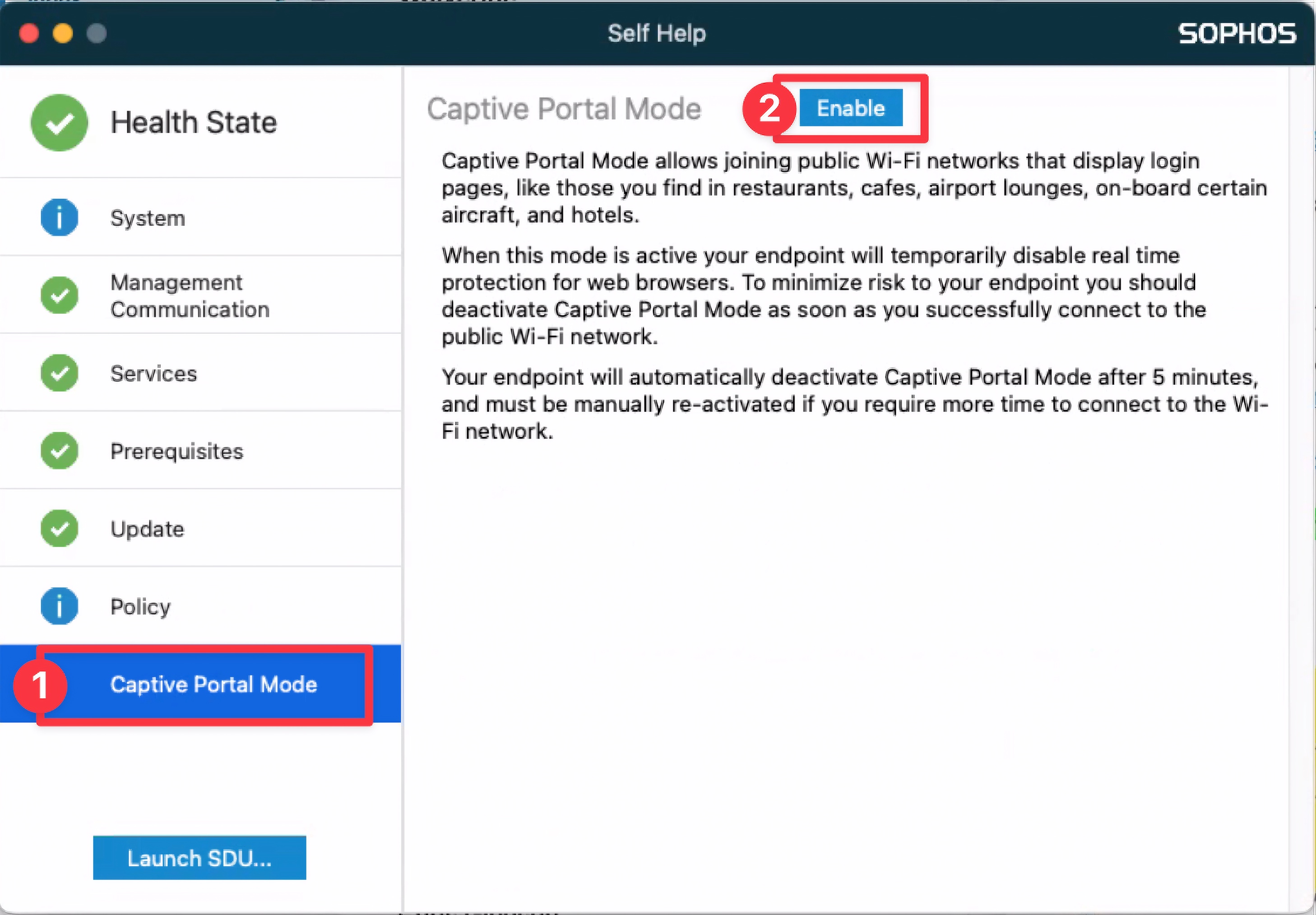 - On the Sophos Endpoint Self Help screen, click the “Captive Portal Mode” button at the bottom of the left sidebar menu. Then click the “Enable” button at the top center of the screen. You may be asked to provide your Mac username and password to enable Captive Portal Mode.
