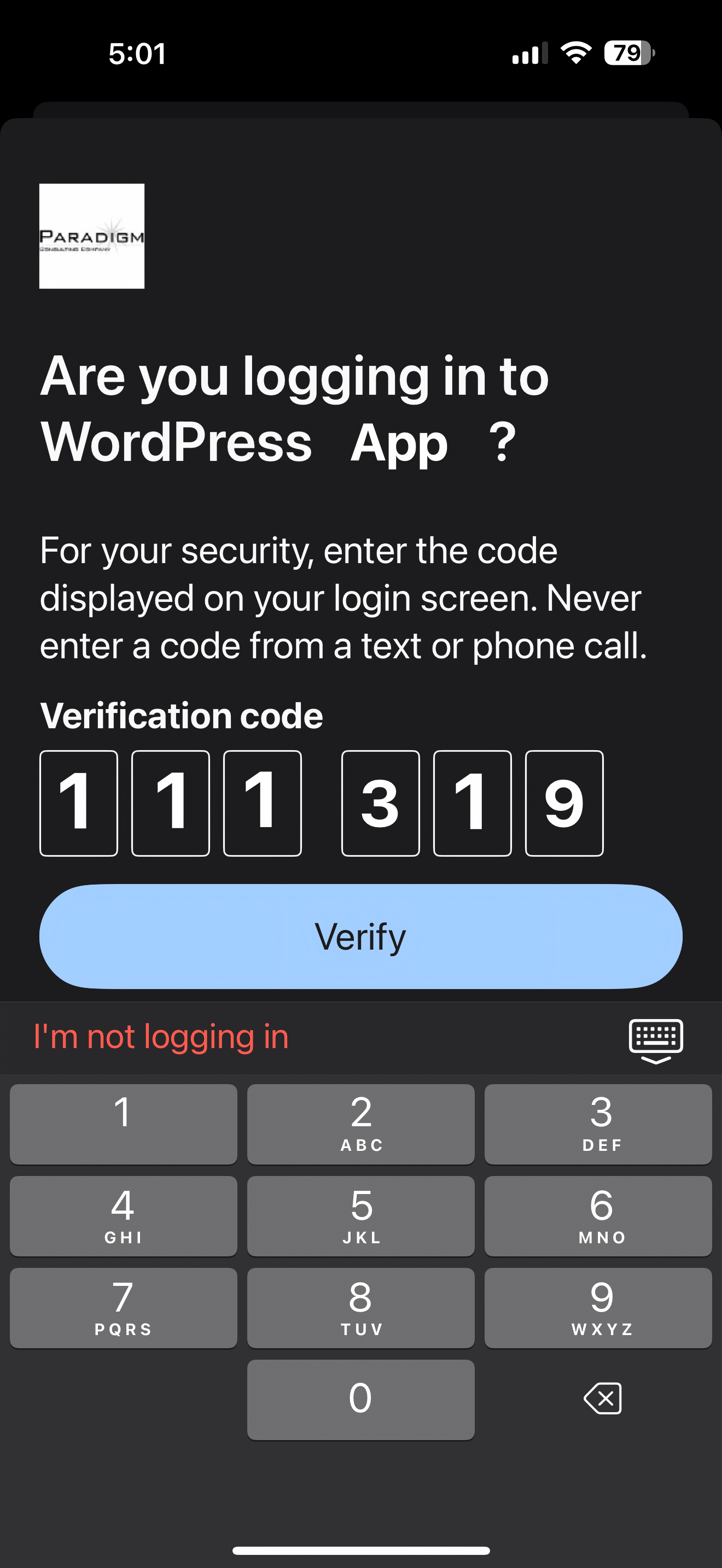 - The Wordpress Duo plugin will show you a code to enter in the mobile app. Enter it in the mobile app and click “Verify”.