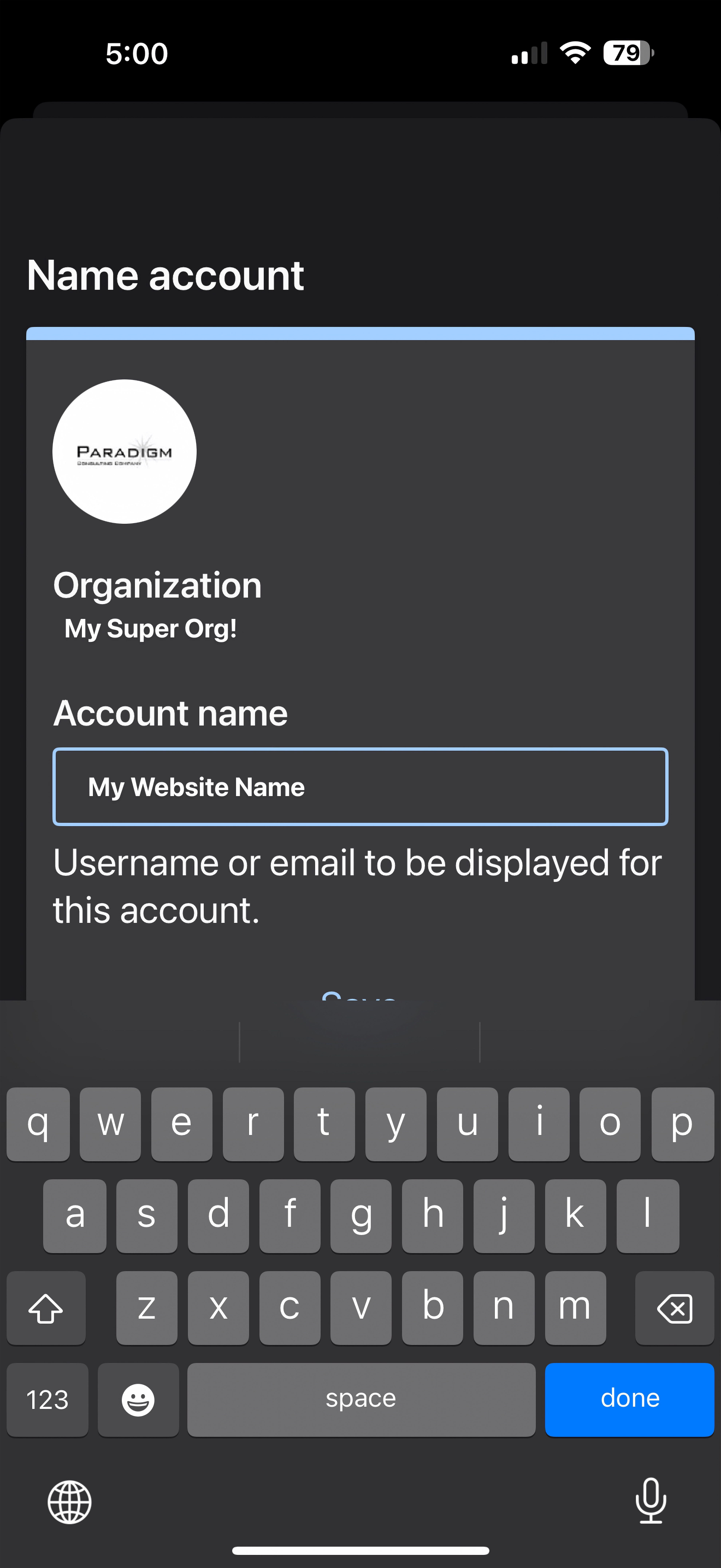 - Name the new account and tap “Save” in the mobile app.