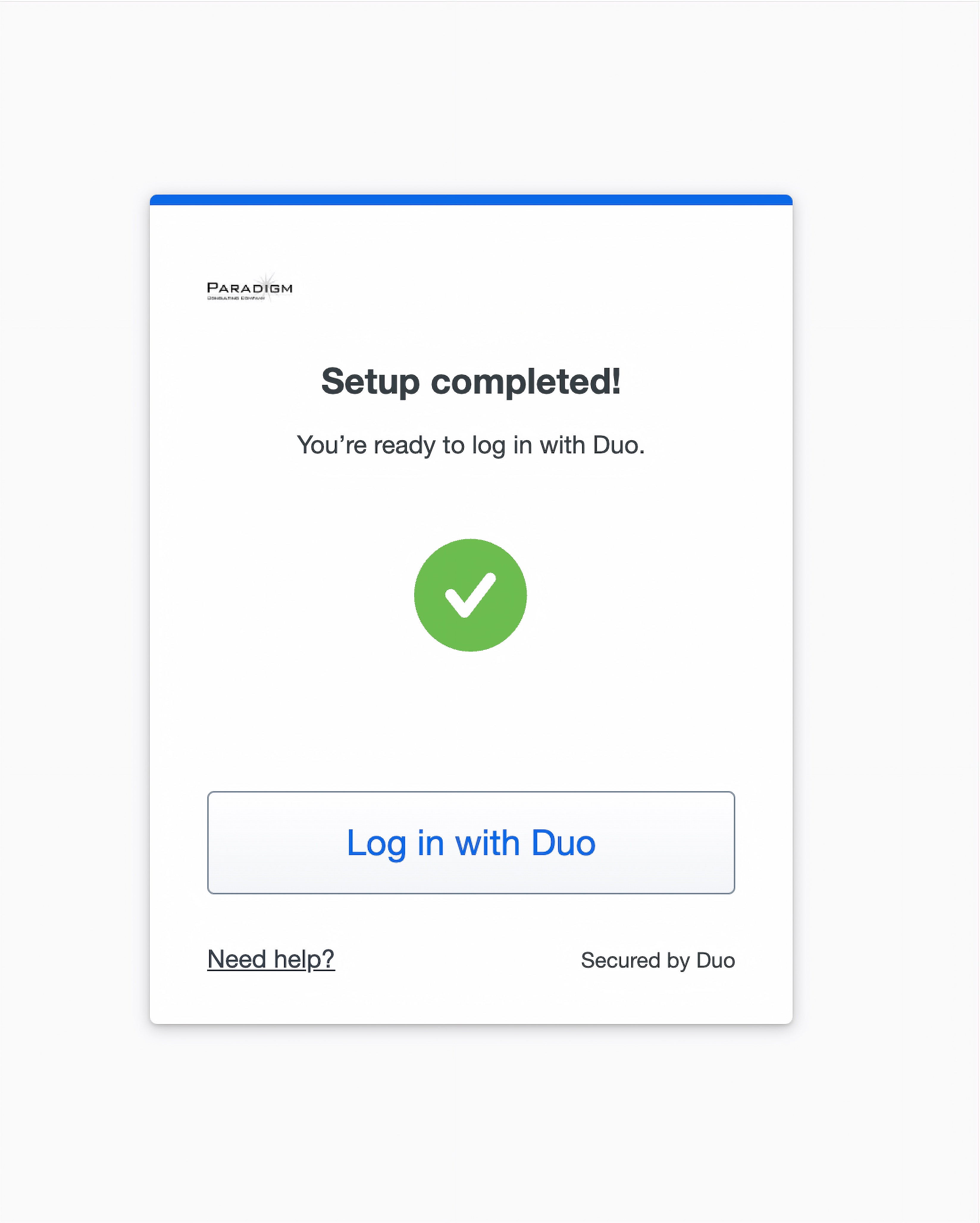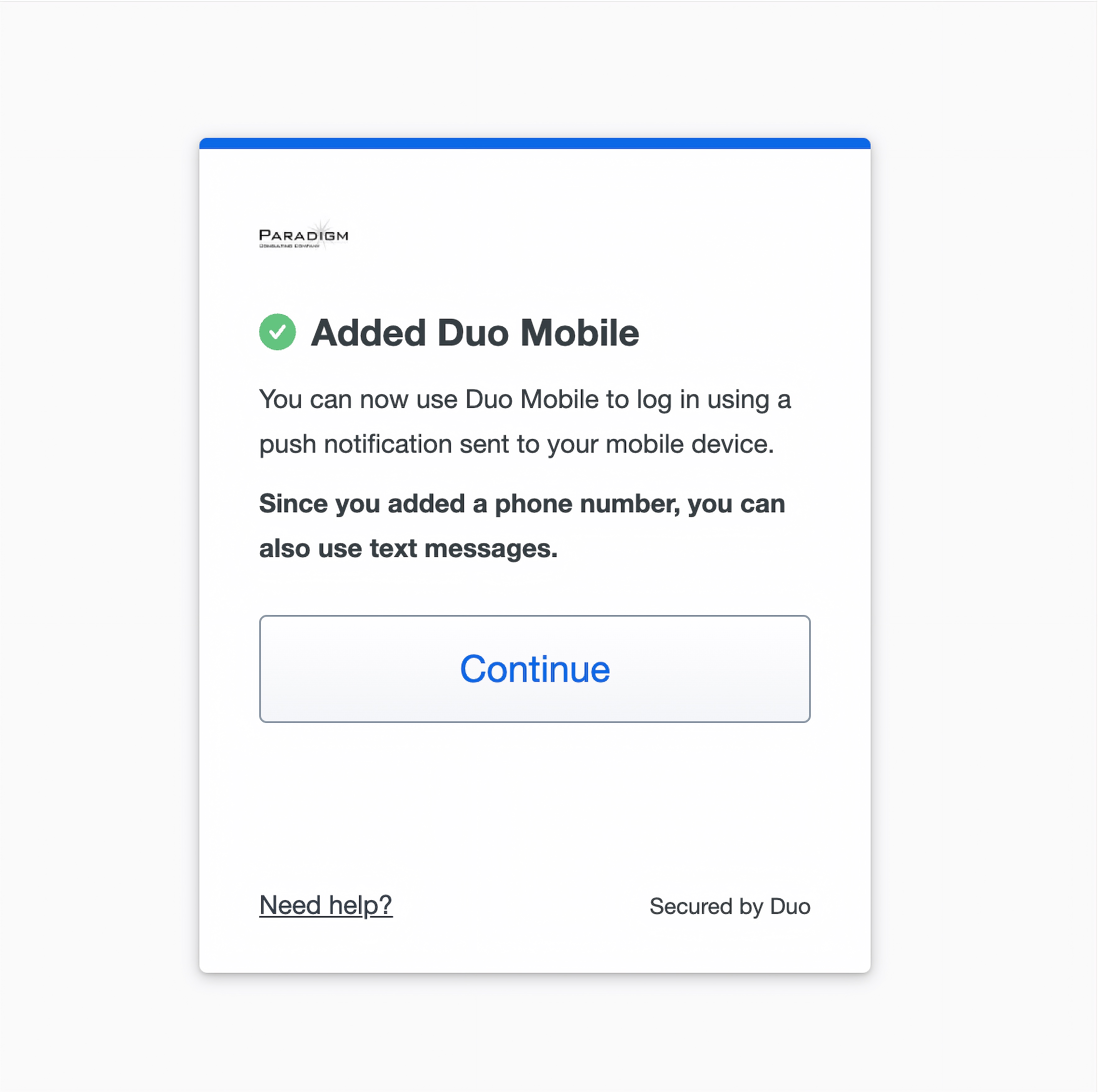 - Duo will show a confirmation that Duo was added. Click “Continue”.
