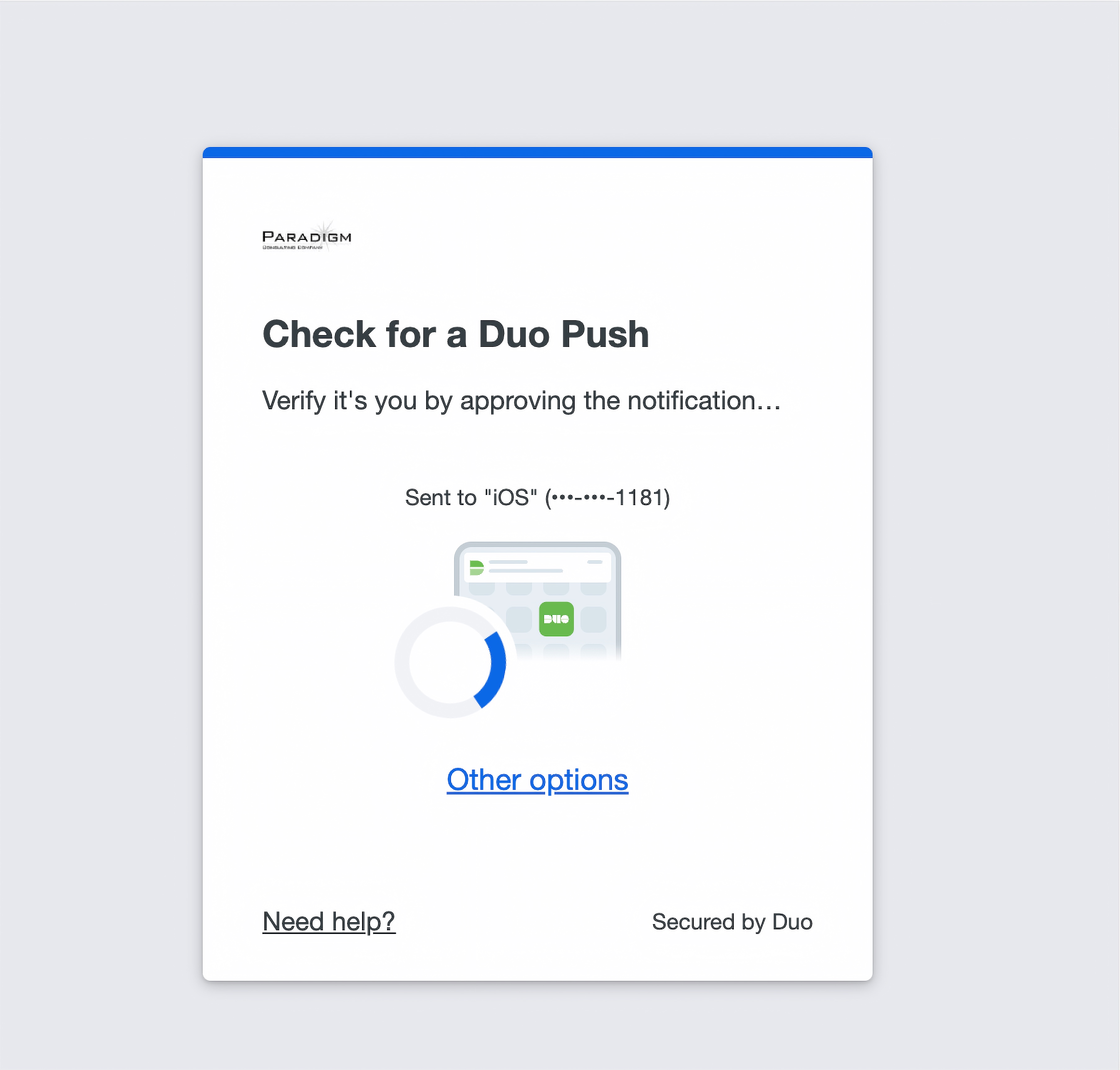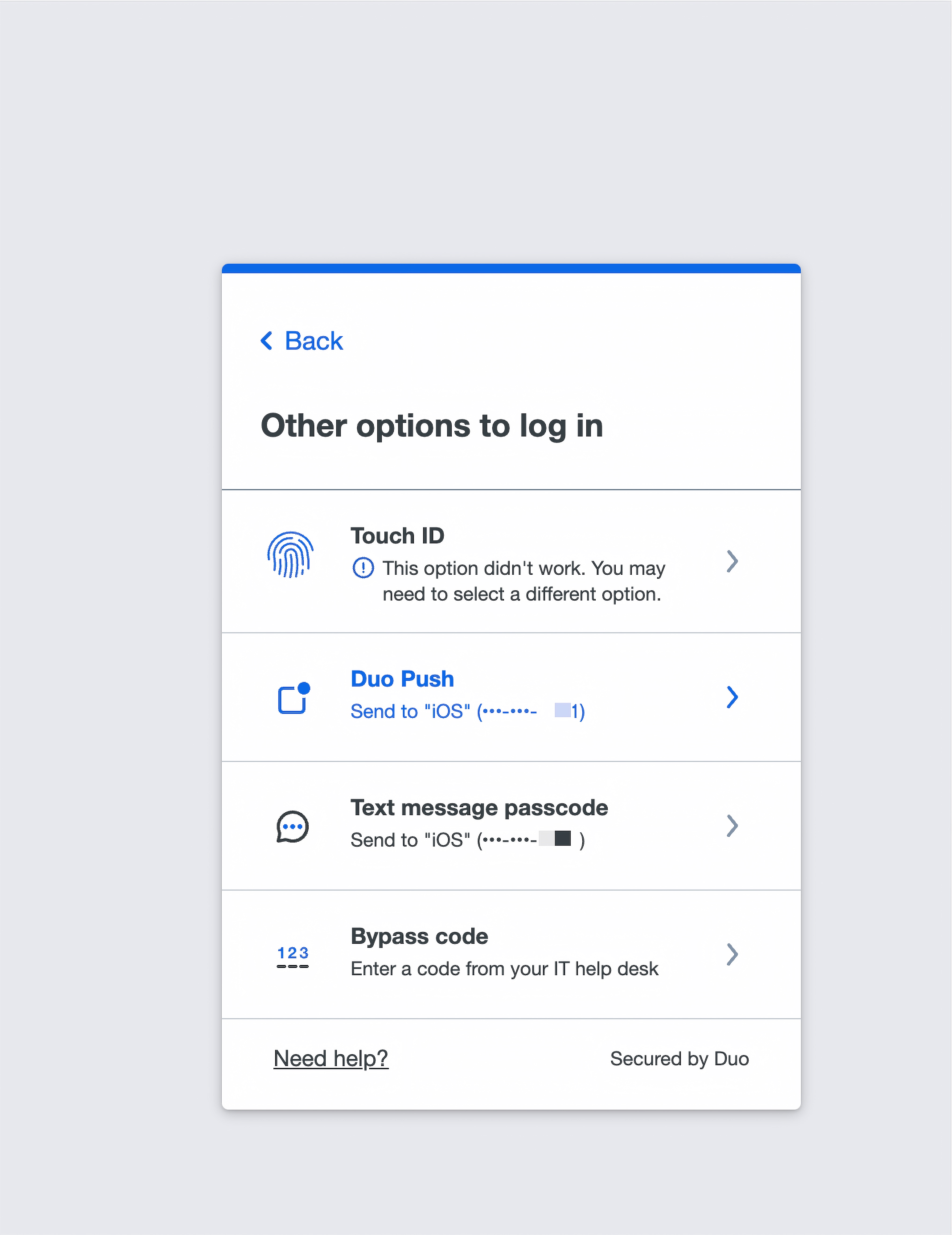 - If Duo shows you “Duo Push” as your login option, click on it. If Duo wants to log you in with an option other than “Duo Push”, tap “Other Options”. Then Tap “Duo Push”.