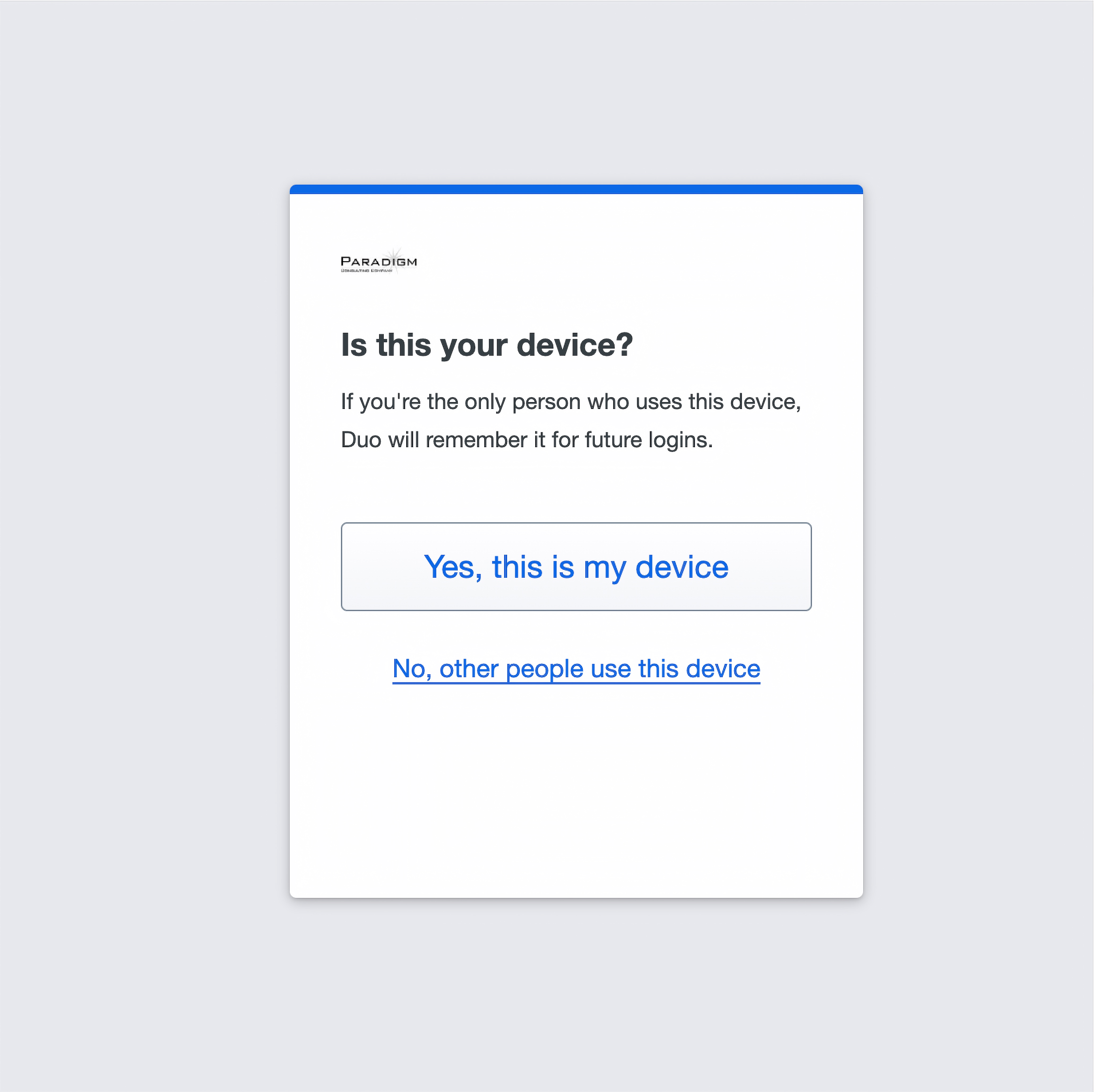 - Once you successfully login with Duo, you’ll be asked if this is your device. Click “Yes, this is my device” to avoid having to use Duo every time you log in.