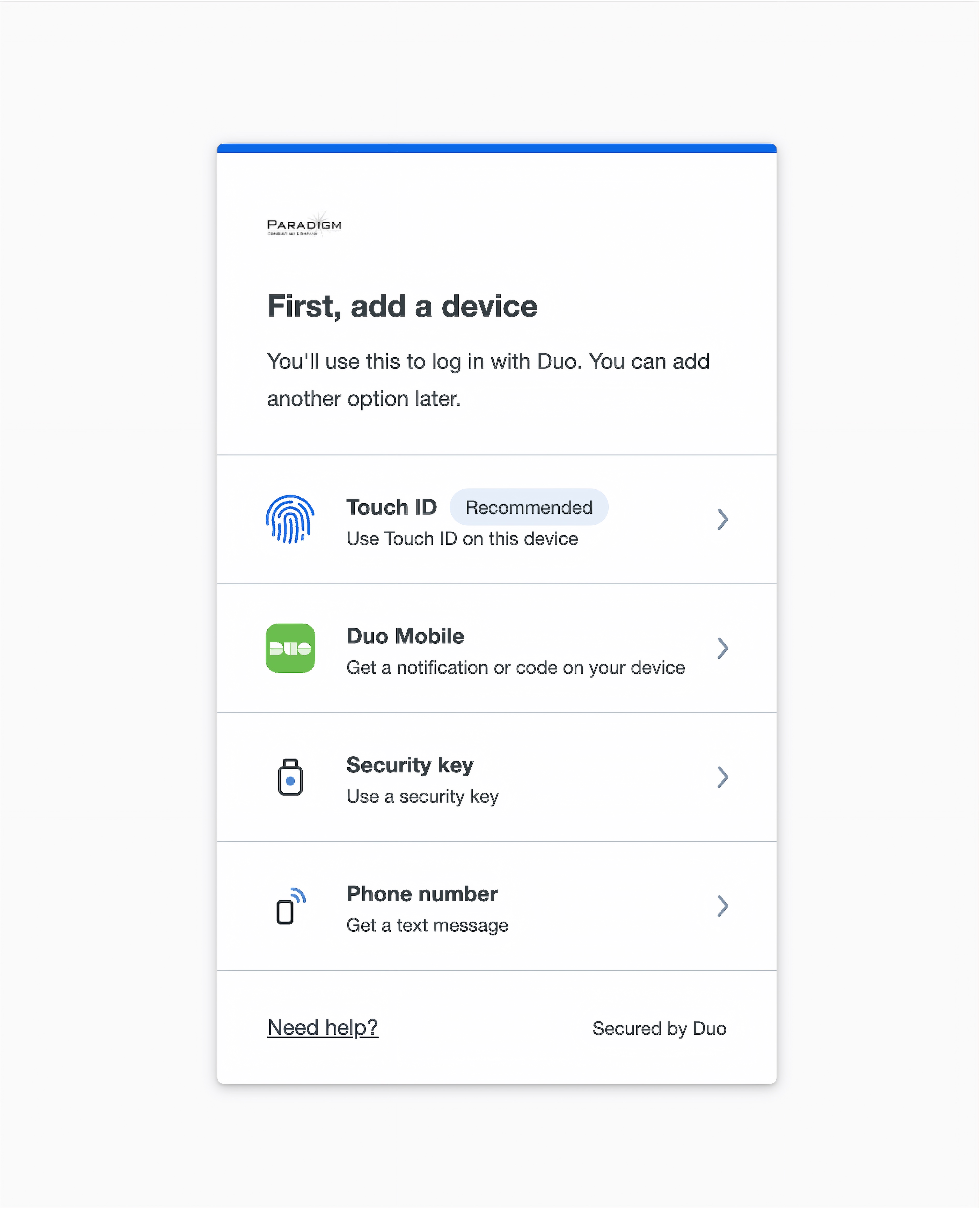 - You will be prompted to add a device. Choose the Duo Mobile option.