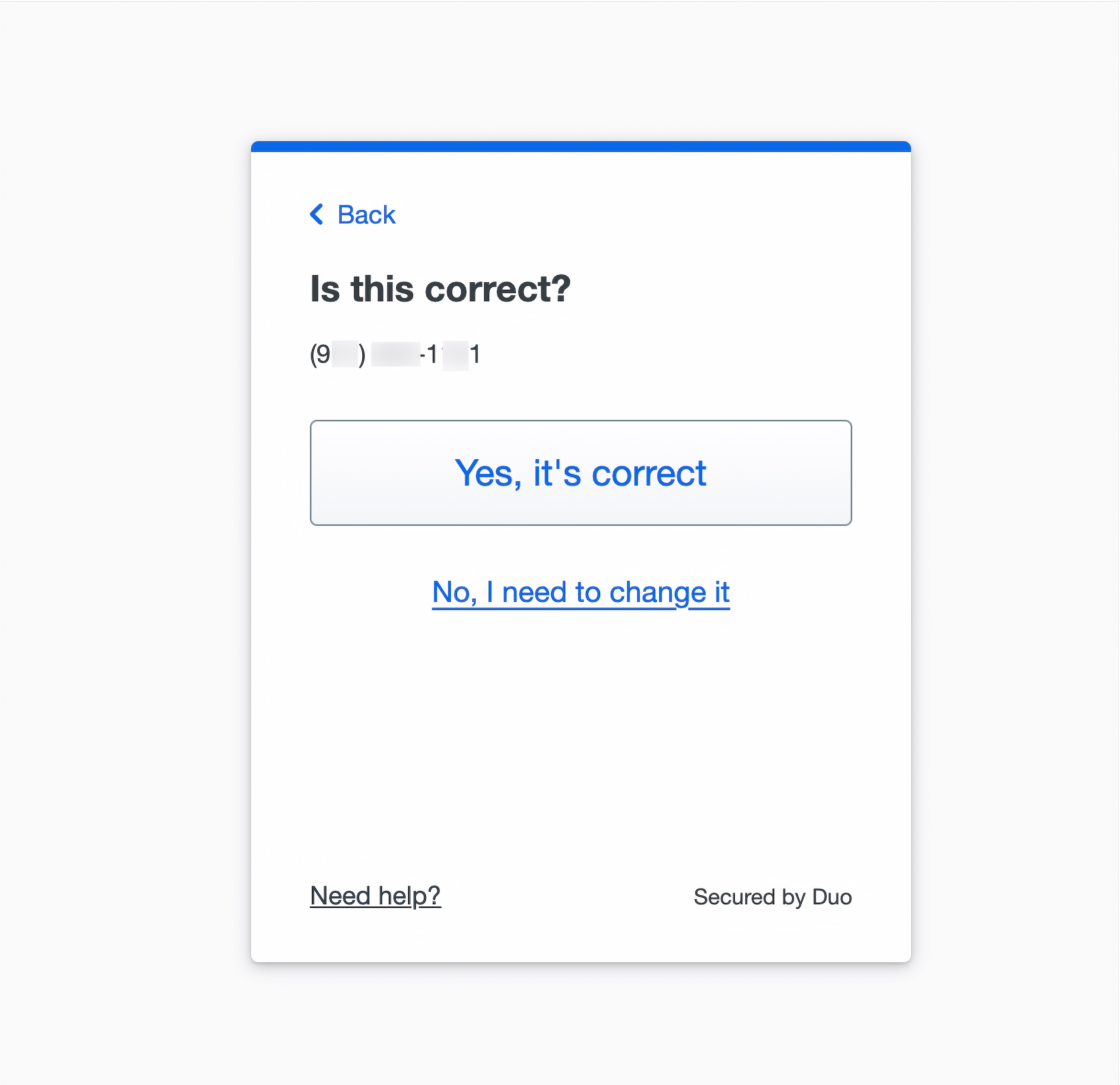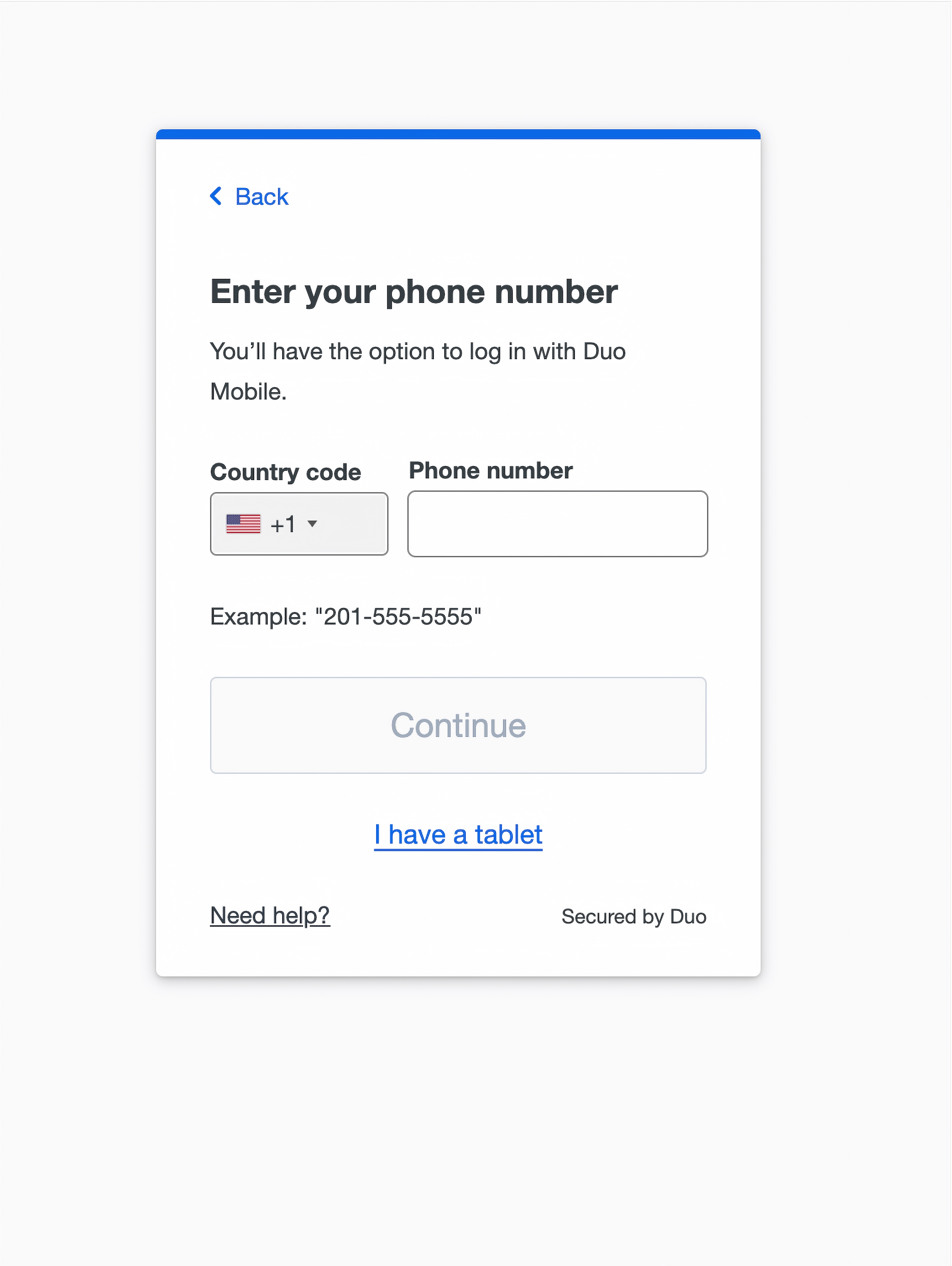 - You will be asked for your phone number. Give the number of the phone you installed the Duo Mobile app on.