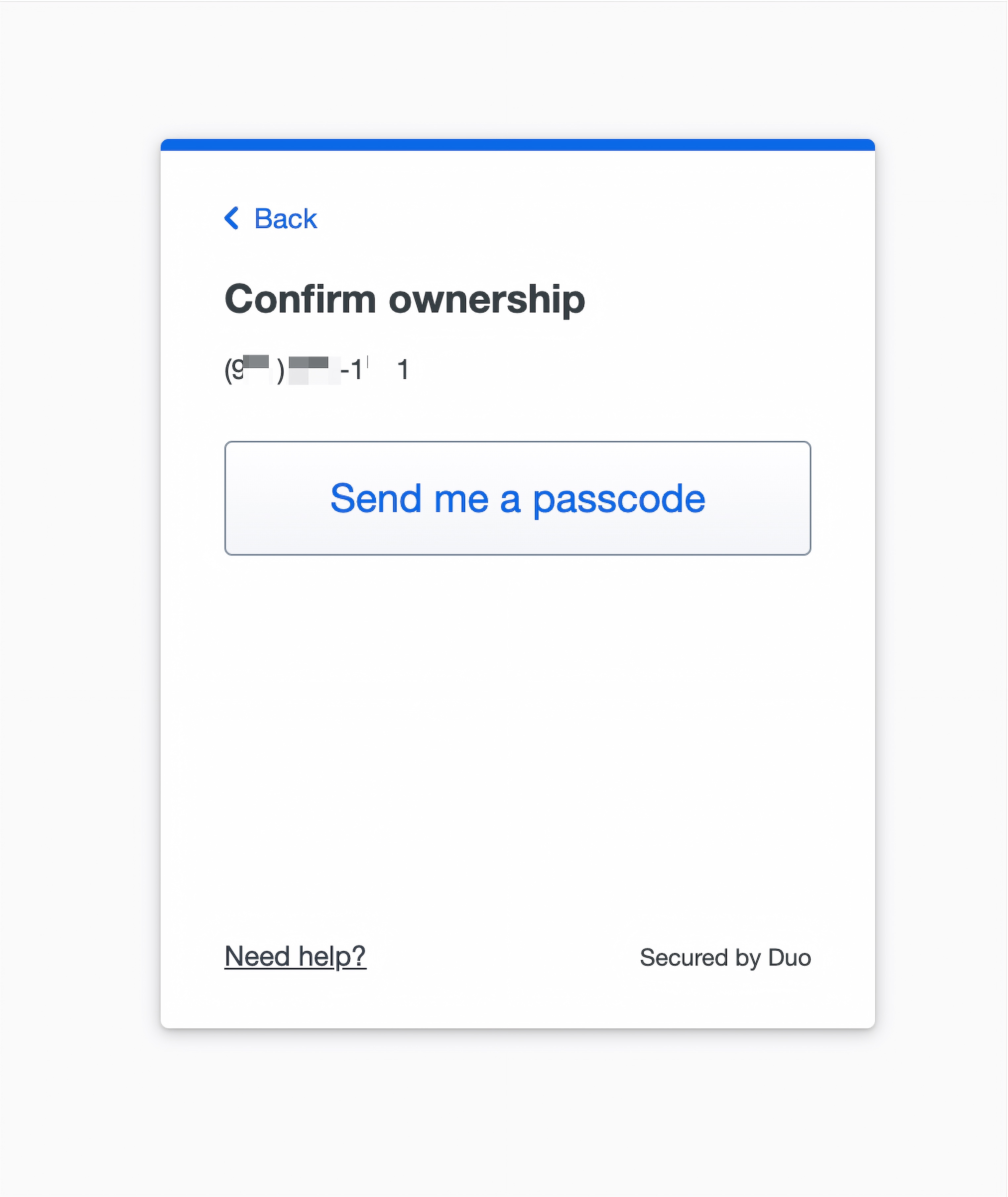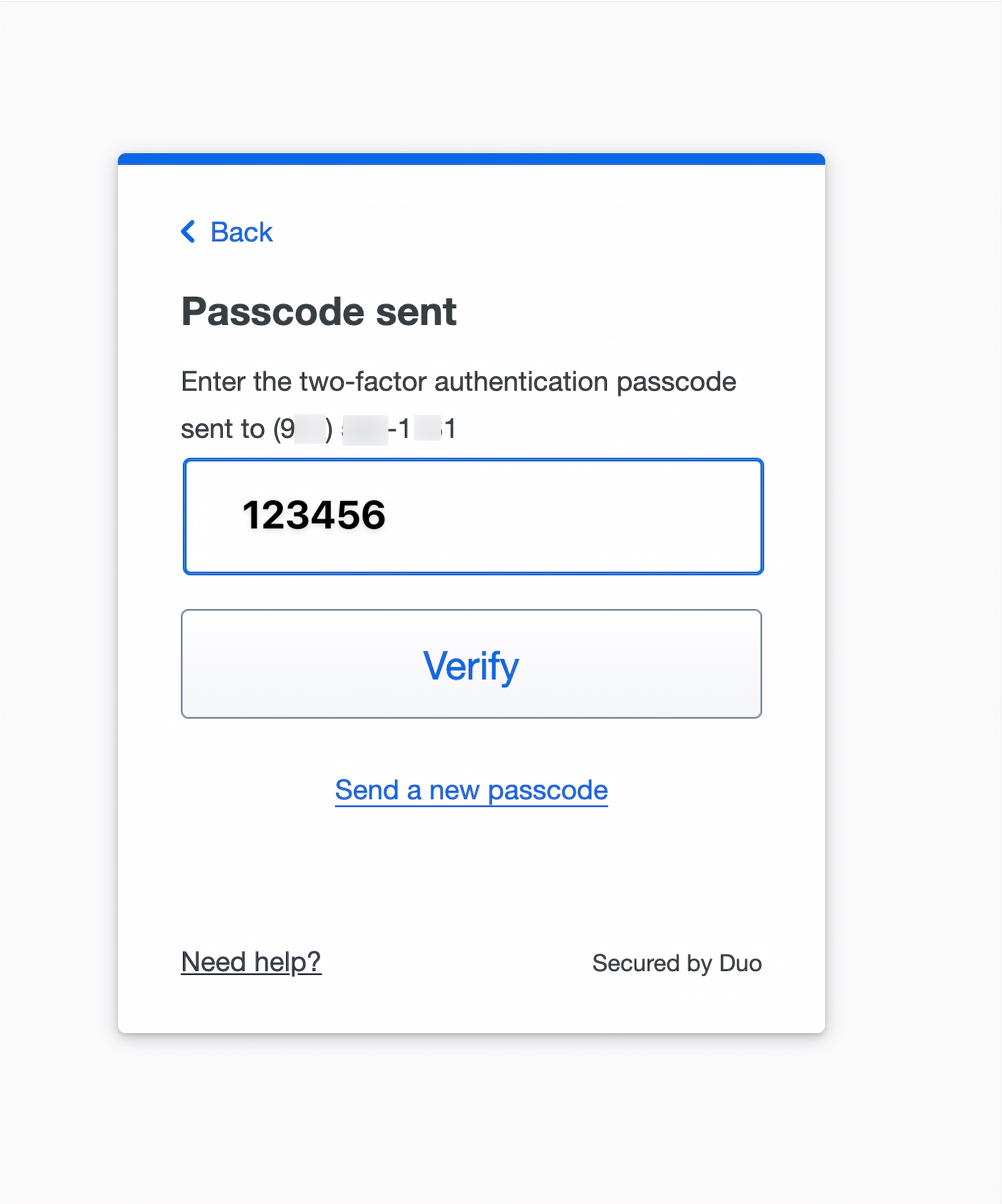 - If Duo prompts to verify your number, click “Send a passcode”. When the passcode arrives, enter it, and click “Verify”.