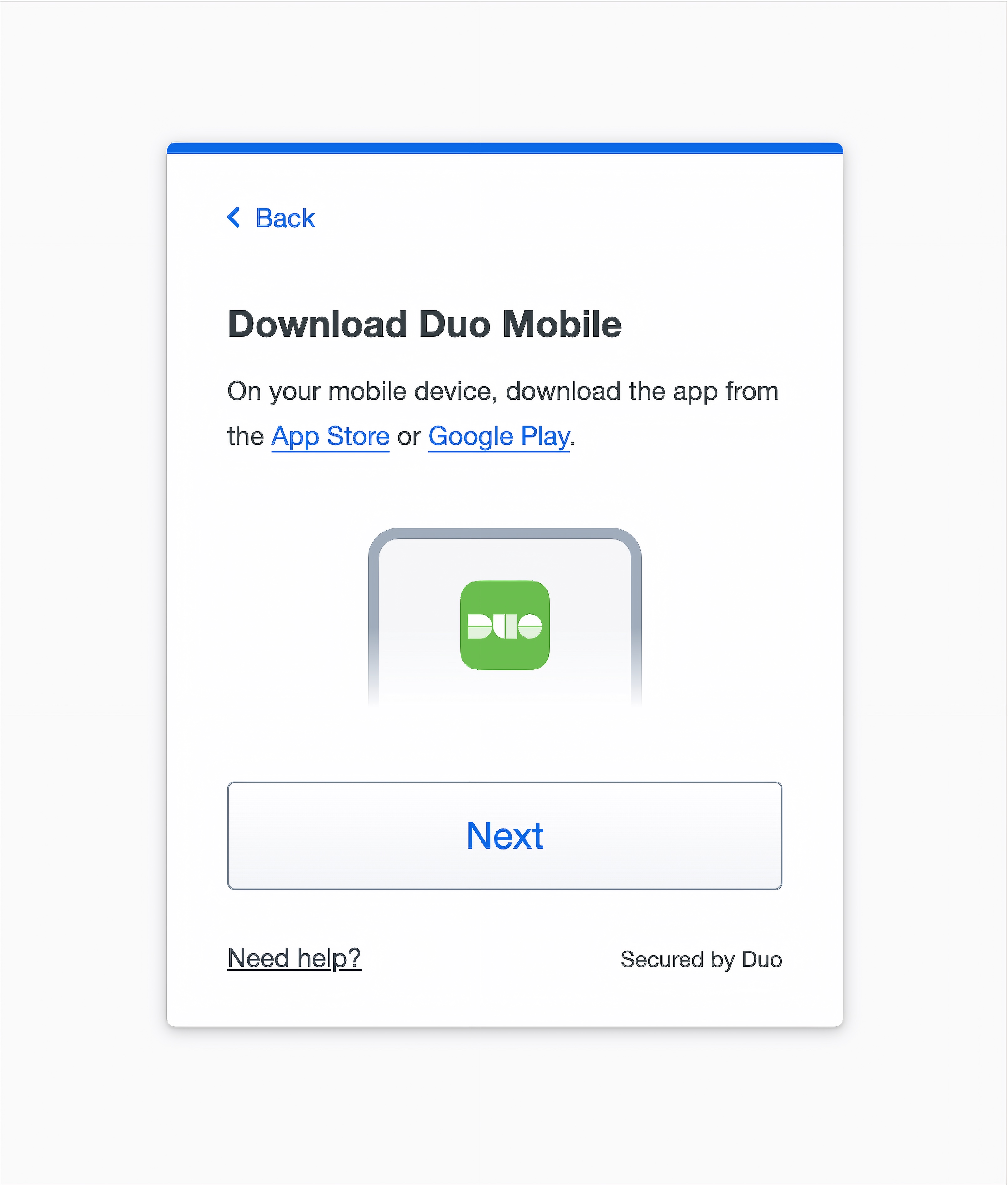 - Download the Duo Mobile App for your phone from the iOS App Store or Google Play Store.