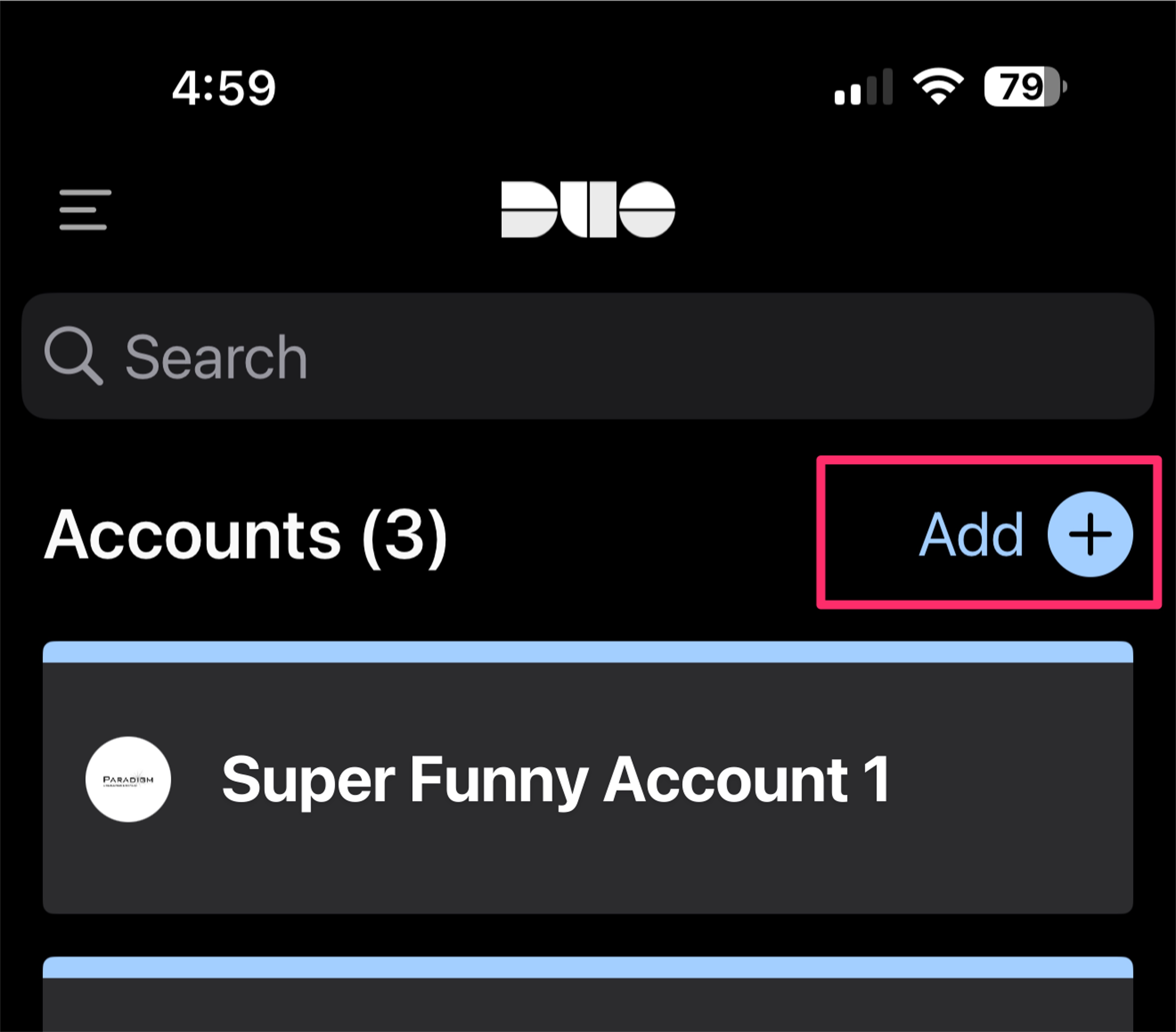 - In the mobile app, click the Add +” button to add a new account.