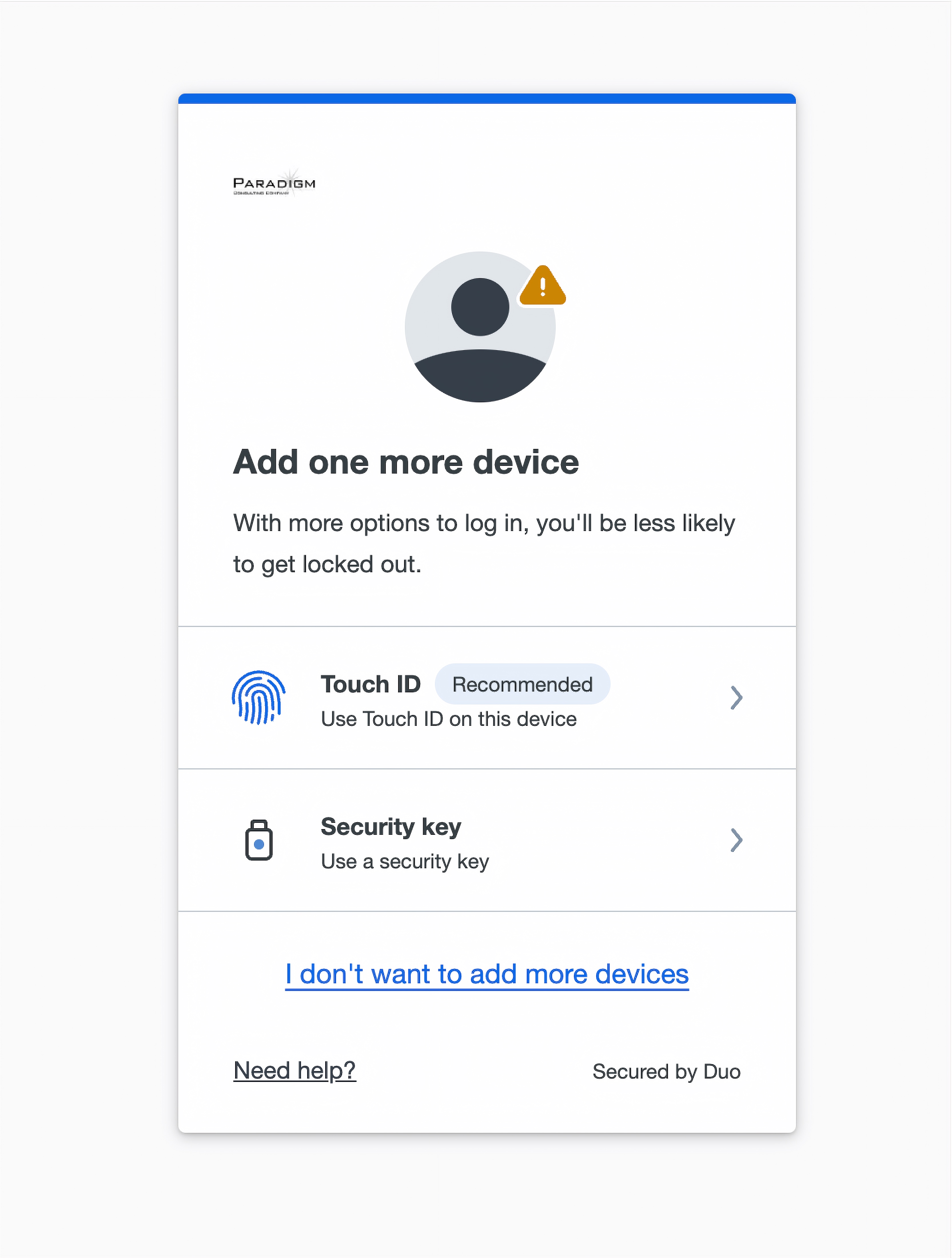 - Duo will prompt you to add a second device. You can add one of the options if one makes sense, or skip this.