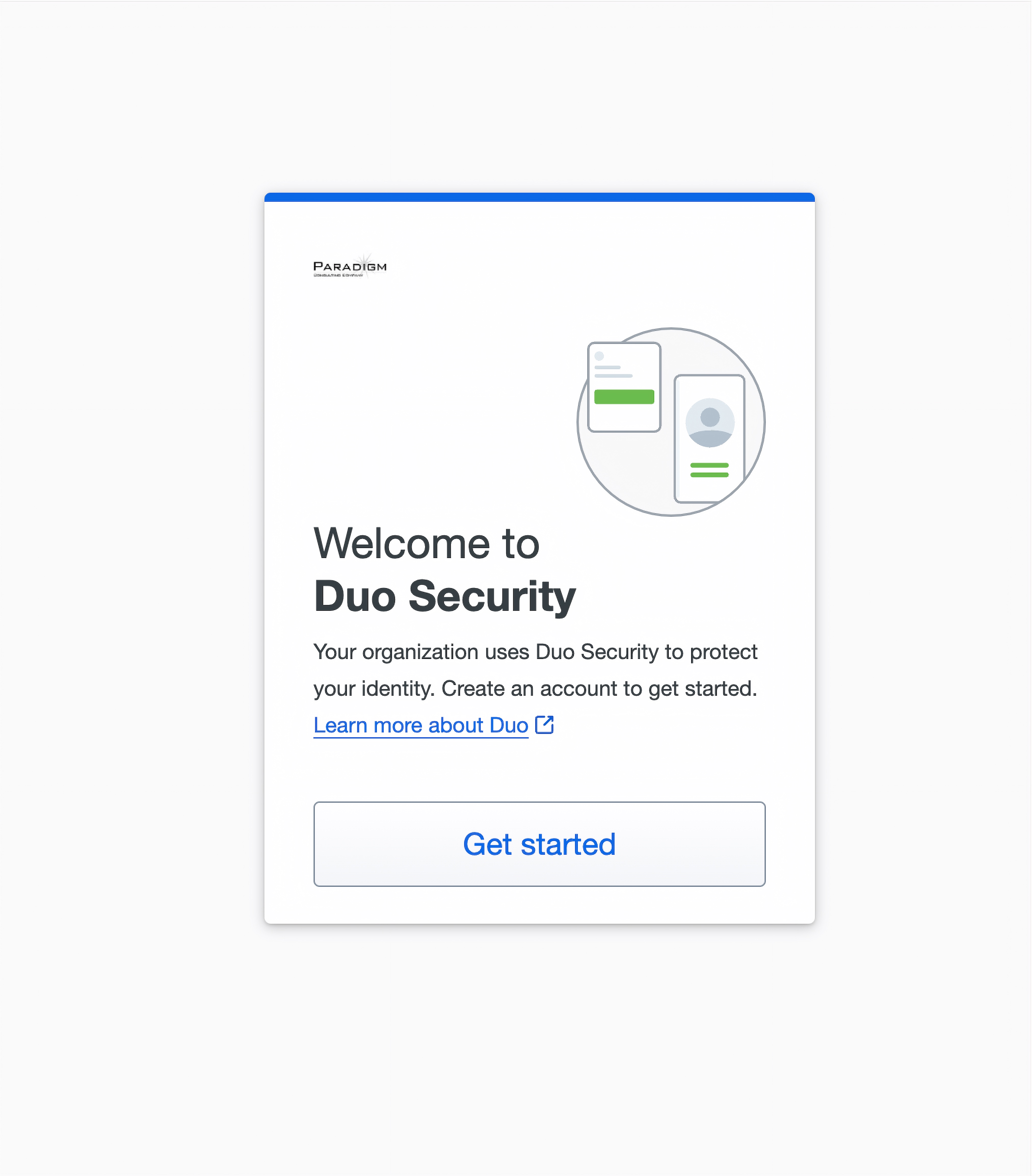 - You will be presented with a “Welcome to Duo Security” screen. Click the “Get Started” button.